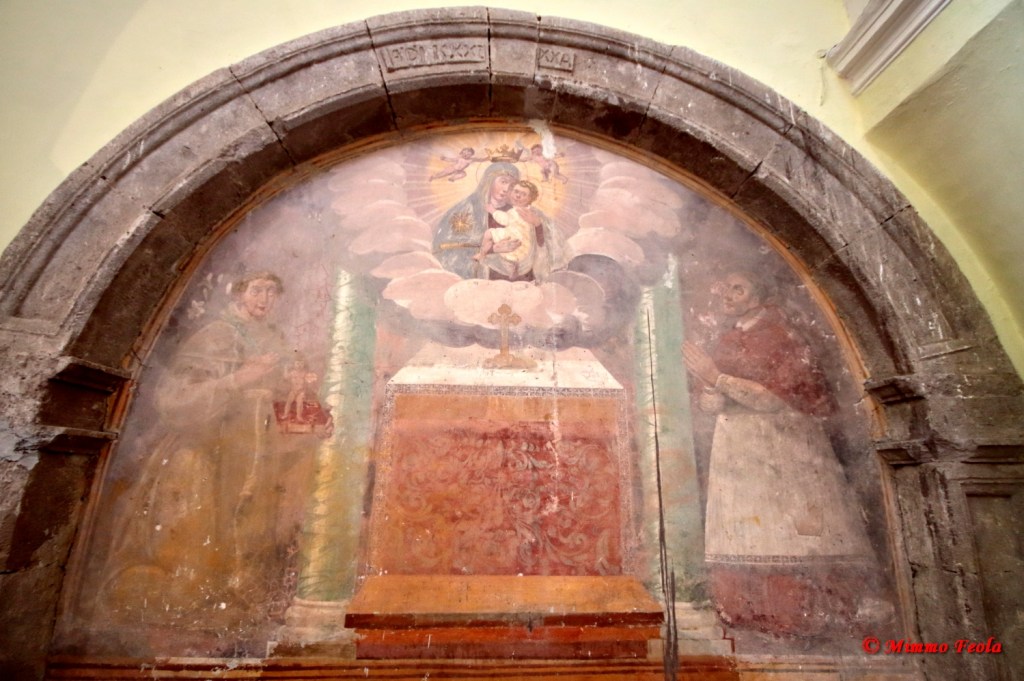 Roccamonfina (CE) – Cicioni – Chiesa di Ognissanti – Dipinto su pietra (sec. XV) – All’interno di un’arco a tutto sesto vi è il dipinto raffigurante la Madonna del Carmine entro una nuvoletta fra Sant’Antonio da Padova e San Carlo Borromeo: entrambi i santi sono a