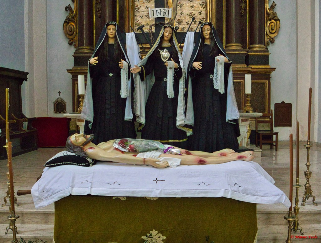 Chiesa di San Giovanni a Villa (XIII – XVIII sec.) – Interno – Statua in cartapesta del Cristo Morto (raffigurazione del Quinto Mistero Doloroso del Santo Rosario) e gruppo statuario delle Tre Marie (riproducenti la Vergine Addolorata e altre due donne)