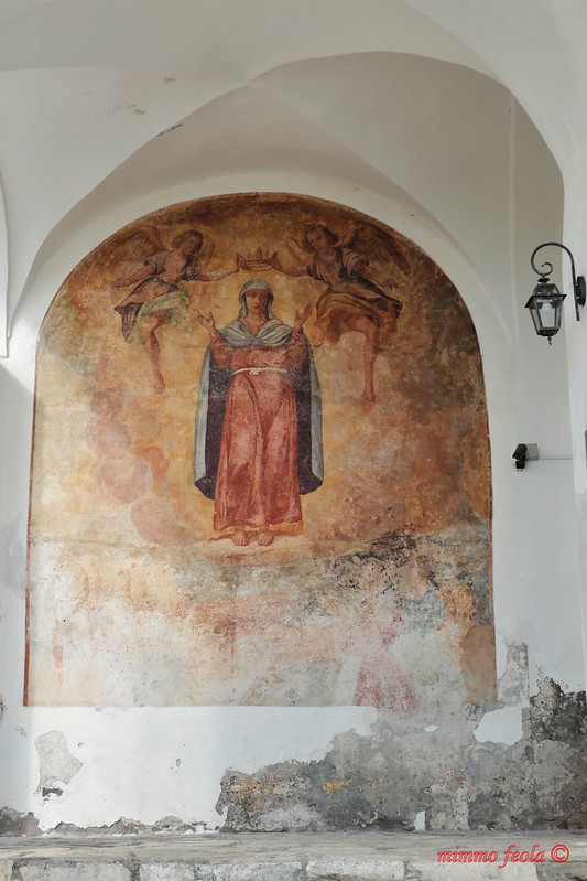 Campania – Piedimonte Matese (CE) – Monte Muto – Il Santuario-Monastero di Santa Maria Occorrevole – L’affresco raffigurante la Madonna incoronata da Angeli sull’ampia scalinata di accesso [vedi le foto]